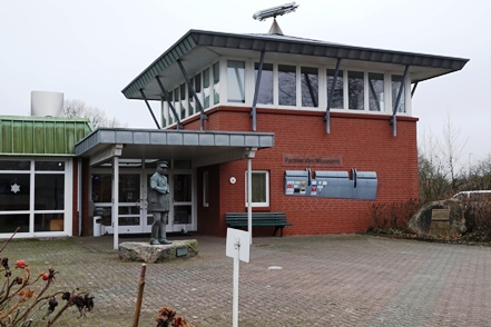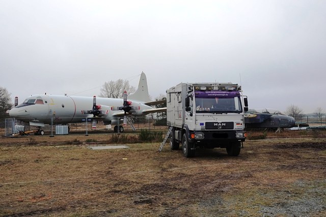Schlechtes Wetter ist ja immer gut für einen Museumsbesuch. Und der, den wir nun vorhaben, ist ein ganz besonderer, darf man doch nach Anmeldung auf dem Gelände inmitten der Exponate im Außengelände mit dem Wohnmobil übernachten. Das Deutsche Luftschiff- und Marinefliegermuseum (Aeronauticum) ist unser Ziel. Wir melden uns an der Kasse, erhalten Informationsmaterial und einen Schlüssel für das Außentor, das natürlich nach der Öffnungszeit verschlossen ist und werden zu unserem Stellplatz gebracht. Wahnsinn – wir sind begeistert, stehen wir doch tatsächlich nah an Flugzeugen, Helikoptern und anderem Gerät. Und, was wir kaum erwartet haben, wir sind alleine hier.