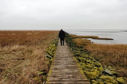 Am nächsten Morgen dann leider deutlich trüberes Wetter. Trotzdem wandern wir durch die Salzwiesen, sehen auch durchaus einige Vögel – wenn auch nicht annähernd so viele wie bei unseren beiden anderen Besuchen hier (LINK). Aber fürs Fotografieren ist es eh zu sehr grau in grau. Nach den Wochen des Wartens bei miesem Wetter zu Hause sind wir trotzdem froh, wieder unterwegs zu sein.