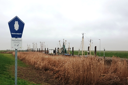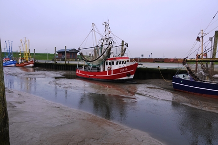 Unser Zuhause verabschiedet sich nach längerer Schlechtwetterperiode mit einem schönen Sonnenaufgang von uns. Das erste Ziel ist nicht weit entfernt, so dass wir bereits am frühen Mittag in Fedderwardersiel ankommen. Der Reisemobilstellplatz, den wir von zwei früheren Kurztripps kennen, ist eigentlich geschlossen, aber nach Rückfrage beim Eigentümer können wir bleiben. Es weht ein kalter Wind, also gibt es trotz des guten Wetters heute nur einen kurzen Spaziergang an den Rand des Naturschutzgebietes Langwarder Groden und zum kleinen Hafen, wo wir an der geöffneten Fischbude unseren Mittagsimbiss genießen.