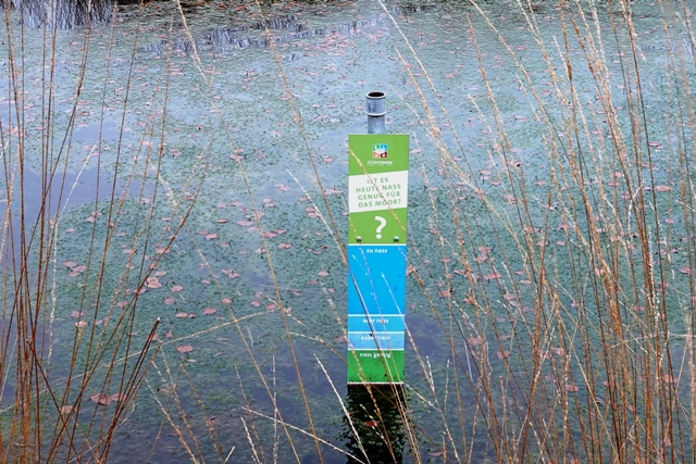 Ein Moorerlebnispfad führt in einer kleinen Runde durch die Moorlandschaft. An insgesamt 22 Stationen erfährt der Spaziergänger hier Wissenswertes zum Ökosystem, seiner Nutzung, den Lebewesen. Leider ist das Wetter ähnlich trübe wie in den letzten Tagen.