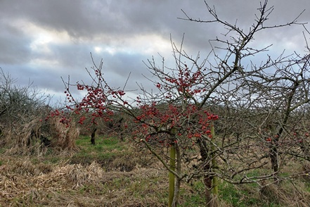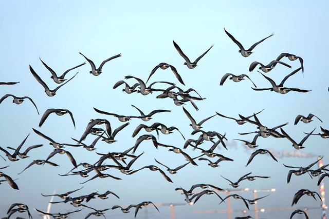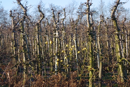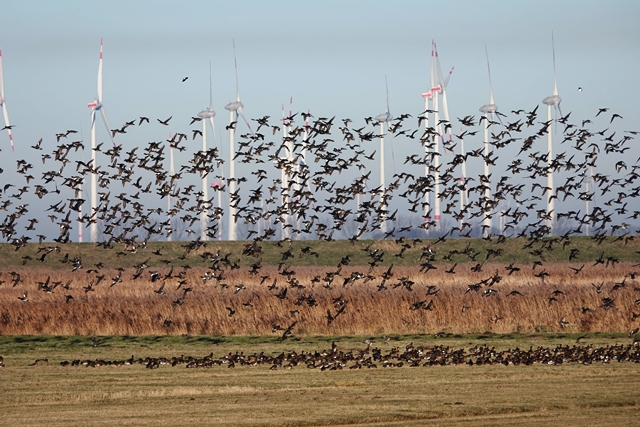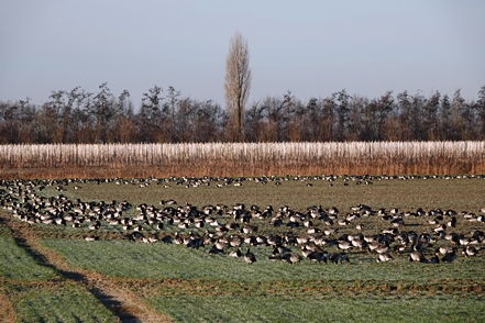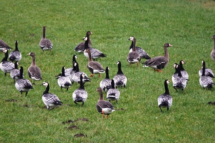 Am frostigen, aber sonnigen 1. Weihnachtstag geht es dann vorbei an ausgedehnten Apfelplantagen mit netter Weihnachtsdeko zum Landschaftsschutzgebiet Kehdinger Marsch. Wie sagt die Infotafel: „Die weiträumige Elbmarschenlandschaft ist ein international bedeutsames Brut- und Rastvogelgebiet. Weiteres Schutzziel ist die Erhaltung und Pflege von Dauergrünland, das von Grüppen, Gräben und Altprielen durchzogen ist.“ Wir laufen bis zur Elbe und sehen tatsächlich große Mengen an Vögeln. Viele Kiebitze (leider kein Foto), einen sehr großen Greif (es könnte ein Seeadler gewesen sein) und vor allem Gänse, Gänse,Gänse. Zumeist sind es Weißwangengänse, die auf den Grünflächen ausreichend Futter finden. Durch Spaziergänger lassen sie sich nicht stören, aber ein vorbeifliegendes Kleinflugzeug scheucht sie vorübergehend auf.