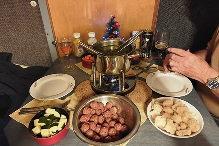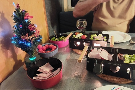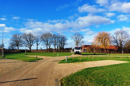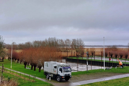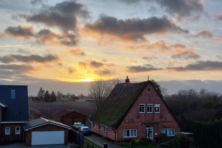 Am nächsten Morgen verlassen wir dann bei deutlich besserem Wetter unseren Nachtplatz. Für die kommenden Tage ist Frost angesagt. Da wäre Strom nicht schlecht, zumal wir im Hinblick auf den zweiten Teil unserer Winterreise auch so einiges an neuem Equipment testen wollen. Wir haben uns den Stellplatz in Krummendeich ausgeschaut. Relativ neu angelegt mit großzügigen Stellplätzen und quasi kein Betrieb. Die Anmeldung erfolgt reibungslos über den CampCard-Automaten, wo man dann auch direkt die Gästekarte erhält, mit der man den Strom freischalten kann. Heute belassen wir es aufgrund des noch recht starken Windes bei einem kurzen Spaziergang zum Deich, wo wir unser morgiges Wandergebiet schon einmal in Augenschein nehmen können, bevor dann am Nachmittag ein schöner Sonnenuntergang den Heiligabend ankündigt. Ein Raclette passt heute sehr gut als Abendessen.