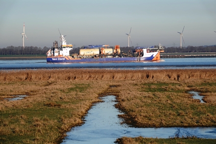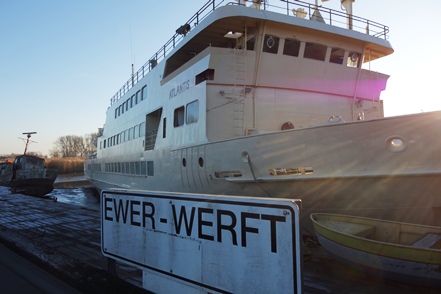Morgen, am Sonntag, wollen wir möglichst früh mit der Elbfähre von Wischhafen hinüber nach Glückstadt in Schleswig-Holstein, um lange Schlangen zu vermeiden. Da brauchen wir einen Platz, der nicht allzuweit entfernt ist. An einem kleinen Hafen – auch hier offiziell gegen Spende erlaubt – bleiben wir. Einen längeren Spaziergang (in Gummistiefeln wegen der schlammigen Wege) unternehmen wir trotz des wieder trüberen Wetters. Am späten Nachmittag klart es dann auf, es wird zusehends kälter. Immer wieder sehen wir Schiffe vorbeifahren. Schon in der Dunkelheit dann in eindrucksvoller Beleuchtung die riesige AidaNova.