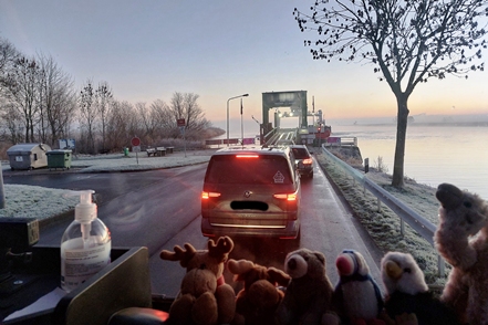 Morgens ist dann alles befroren, wir müssen erst einmal kratzen, bevor wir auf leicht glatten Straßen Wischhafen erreichen. Nur ein paar Minuten dauert es, dann können wir auf die Fähre und durch eine mystische, neblige Landschaft geht es hinüber ans andere Elbufer.