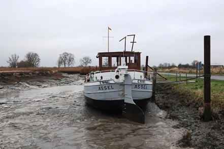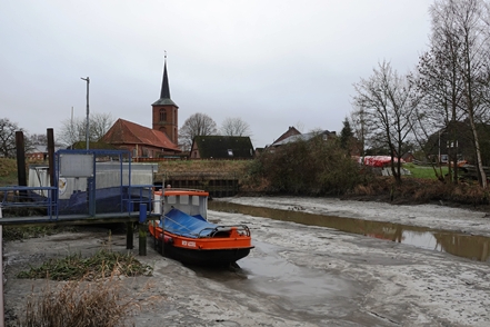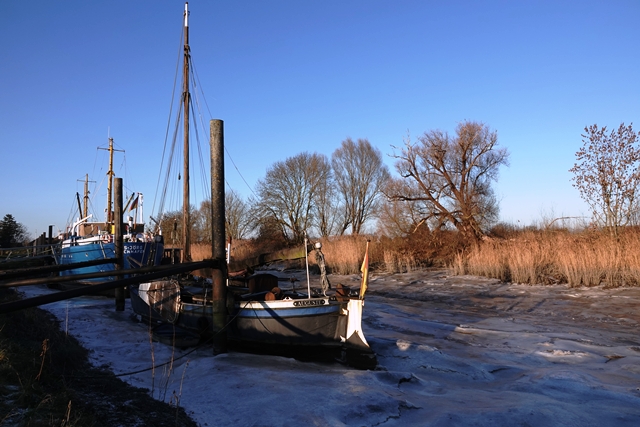 Wir fahren nach Wischhafen zum Museumshafen. Die Schiffe liegen trocken auf Eis. Auf dem kleinen Wohnmobil-Stellplatz direkt am Hafen – Spende erbeten – verbringen wir eine ruhige und nicht mehr frostige Nacht.