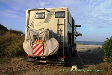 Da Fahrräder hinten auf einem offenen Fahrradträger selbst bei Abdeckung mit einer entsprechenden Fahrradplane sehr stark verschmutzen, haben wir uns von der Firma Krodinger Metall eine Heckbox aus Aluminium anfertigen lassen, die auf dem Grundgerüst des vorhandenen Fahrradträgers aufgesetzt wird.