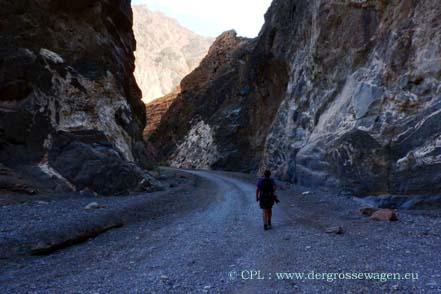 Die letzten Meilen führen dann durch den eigentlichen Titus Canyon, später dann die sogenannten Narrows - also eine längere Engstelle. Unten am Ausgang des Canyons dann viel Betrieb, der Parkplatz ist hoffnungslos überfüllt.