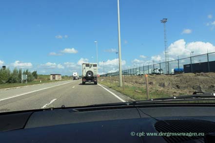 Am darauffolgenden Montag geht es dann endlich los. Herfurth Logistics hat alles gut vorbereitet und hilft bei den erforderlichen Formalitäten. Diesmal sind wir für diese Hilfe sehr dankbar, denn Zoll und Abfertigung für die mittlerweile zu Grimaldi gehörenden ACL-Schiffe sind nun in einer ganz anderen Ecke des Hafens. Aber es geht alles zügig vonstatten und bald können wir in den Hafen hinein, wo der Große Wagen auf uns wartet. Wie gut, dass wir die Kippschalter für Allrad und Sperren außer Betrieb gesetzt haben, denn irgendwelche Idioten konnten sich wohl nicht verkneifen, an diesen Schaltern herumzuspielen! Ein Tagfahrlicht hat man mit Gewalt abgerissen, ansonsten sieht alles OK aus. Es geht heimwärts, wo viel Arbeit wartet.