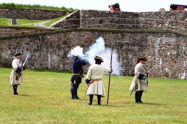 Mittags wird mit originalgetreuen Musketen geschossen und Kanonen (von Touris, die dafür gut zahlen) abgefeuert. Das letzte muss man nicht unbedingt gesehen haben, aber insgesamt, so finden wir, durchaus einen Besuch wert.