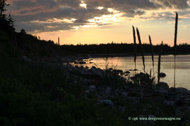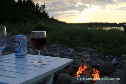 Weiter geht es Richtung Halifax. Zunächst fahren wir den Fleur de Lis Trail. Unterwegs in Port Hawkesbury noch einmal Gelegenheit einzukaufen, bevor wir den Marine Drive erreichen. Diesen verlassen wir bald, um Richtung Canso zu fahren. Entlang der Strecke teilweise ein Blütenmeer. Hier verbringen wir zwei Tage bei bestem Wetter am Kiesstrand, erhalten wiederholt Besuch von Seehunden, beobachten Scharen von Möwen, die irgendetwas von der Wasseroberfläche aufpicken. Abends können wir endlich mal wieder ein Lagerfeuer machen.