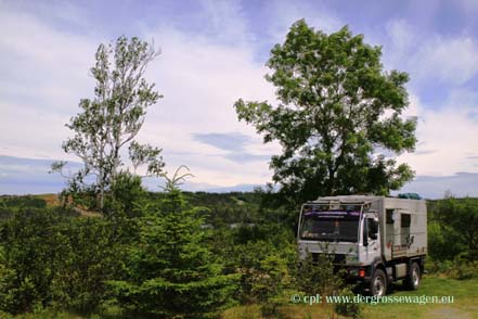 Etwas entfernt finden wir auch einen schönen Platz, leider ist aber mittlerweile Nebel aufgezogen - hat er uns mal wieder eingeholt. Am nächsten Morgen ist er verschwunden, und wir bleiben einfach hier, wandern etwas an der Küste, sitzen draußen in der Sonne. Die Sumpfiris stehen in voller Blüte.
