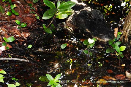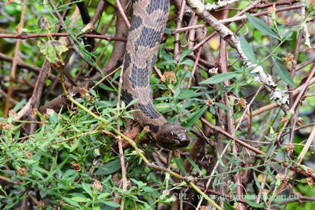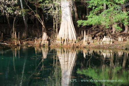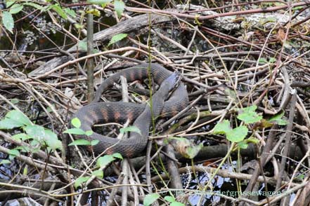 Im Manatee Springs State Park soll es die Tiere auch geben. Hier auf dem Campground ist ausnahmsweise einmal wenig Betrieb, und wir können uns einen der großzügigen Plätze aussuchen. Manatees gibt es im Moment nicht, man erklärt uns, dass die Tiere erst kommen, wenn die Temperaturen sinken. Da sie eine höhere Wassertemperatur benötigen, suchen sie dann die warmen Quellgewässer auf. Und das ist jetzt bedingt durch das ungewöhnlich warme Wetter für diese Jahreszeit noch nicht der Fall. Zahlreiche Besucher schwimmen und tauchen hier. Uns animiert die Quelle allerdings nicht zu einem Bad, sehen wir doch auf den Sträuchern rundherum zahlreiche Schlangen - man muss allerdings teilweise genau hinschauen, um die Tiere zu entdecken.