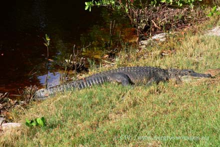 Von hier aus fahren wir ein Stück zurück zum Shark Valley, das zum Everglades Nationalpark gehört. Schon kurz vor der Öffnungszeit stehen wir vor der Schranke, heute ist Veterans Day, da wird es später sehr voll werden. Aber jetzt ist quasi noch nichts los. Wir mieten uns Fahrräder. Diese sind leider in keinem besonders guten Zustand - hätten wir doch nur wie die letzten beiden Male in Amerika unsere Mountainbikes dabei! Damals haben wir sie nur wenig genutzt, jetzt hätten wir sie schon mehrfach gut einsetzen können. Aber das lässt sich jetzt halt nicht mehr ändern. Entlang des Kanals sind zahlreiche Tiere zu beobachten. Leider liegen keine Alligatoren am Wegesrand - wie wir es von einem Besuch vor mehr als 20 Jahren in Erinnerung haben. Aber versteckt unter Bäumen entdecken wir im Wasser eine Alligator-Mutter mit ihren zahlreichen Jungen.