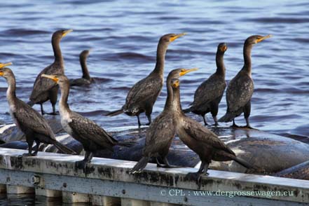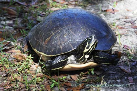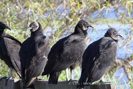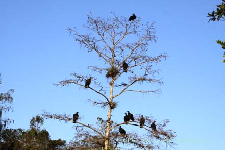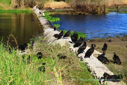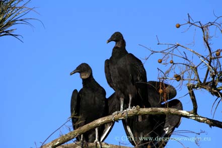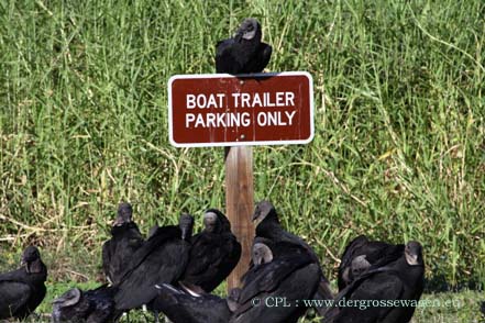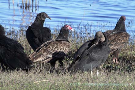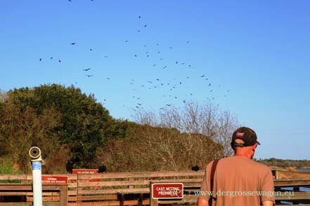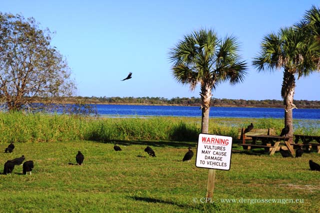 Aber absolut beeindruckend sind die unzähligen Geier, die sich im Bereich des Myakka-Sees aufhalten. Die Tiere kommen hier in solch unvorstellbaren Mengen vor, dass sie regelrecht zur Plage werden, anscheinend richten sie auch gerne einmal Schäden an Fahrzeugen an. Sie scheinen Gummi zu mögen. Mehrmals täglich versucht man, sie mit Kanonenböllern zu verjagen, aber der Erfolg ist immer nur ein sehr kurzfristiger. Wir auf jeden Fall freuen uns, diese großen Vögel so aus der Nähe betrachten zu können. Schaut man genau hin, so entdeckt man zwischen den vielen Rabengeiern auch schon einmal Truthahngeier.