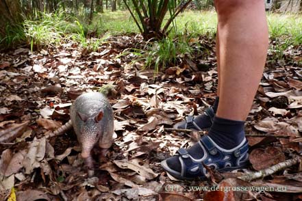 Direkt an unserem Platz dann wieder Gelegenheit zur Tierbeobachtung. Besonders angetan sind wir vom Gürteltier, das regelmäßig auf Nahrungssuche den Boden um uns herum absucht. Ob es Christine gar nicht gesehen hat? Den Moment, in dem es seine Nase an Christines Füße hielt, hat der Fotograf leider nicht festgehalten.