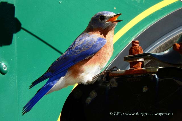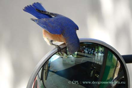 Die Tramtour zu den Großflugzeugen ist eher langweilig, aber faszinierend ist der Western Bluebird, der hier eigentlich nicht vorkommen sollte. Ob das der Grund ist, dass er wie magisch angezogen immer wieder in den Spiegel der Tram hineinschaut - und einen Gefährten sieht???