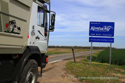 Bei der Umrundung des Sees überqueren wir auch schon einmal die Grenze nach Kentucky. Entlang der Bahngleise und Straßen große Mengen an Geiern, die hier anscheinend nur auf den gedeckten Tisch warten müssen. Denn nirgendwo sieht man so viel tot gefahrene Tiere wie in Amiland.