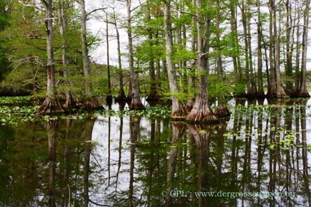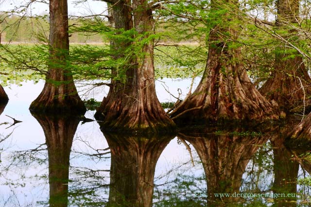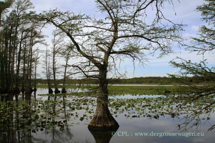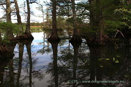 Eigentlich wollen wir etwas länger am Reelfoot Lake bleiben, vielleicht sogar unser Boot aufbauen, aber der Haupt-Campground im Süden gefällt uns gar nicht, ist er doch sehr gut gefüllt und liegt dazu direkt neben der recht stark befahrenen Straße. Auf dem schöner gelegenen North Campground wird gerade das Sanitärgebäude instandgesetzt, damit ist er auch keine Option. So beschränken wir uns darauf, den See einmal zu umrunden, Stiche und kürzere Loops zu fahren. Schade - Bootfahren in der Sumpfzypressenlandschaft wäre sicherlich interessant gewesen.