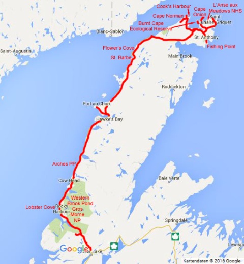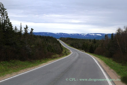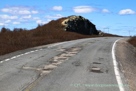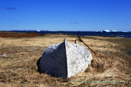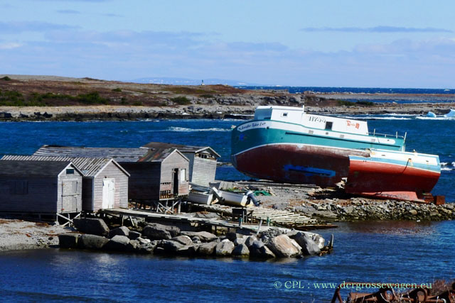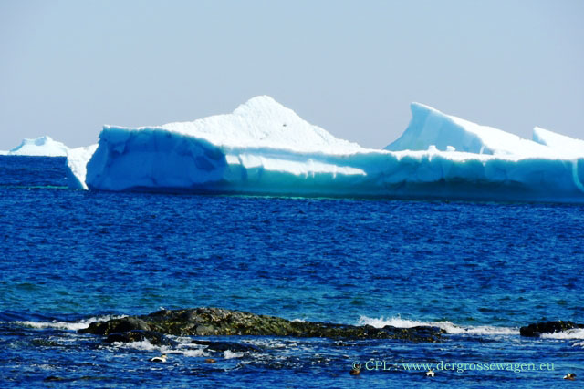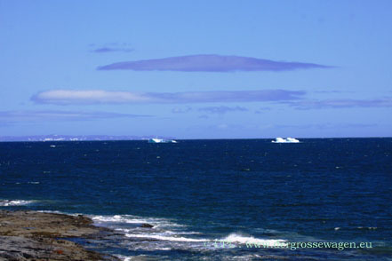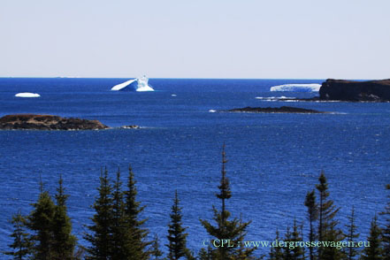 Auf einer - wie so häufig - schlechten Straße fahren wir Richtung St. Anthony. Neufundländische Straßen sind ein Thema für sich - teilweise übersät mit Schlaglöchern und Frostaufwölbungen. Fast noch schlimmer sind aber die stellenweise tiefen Quer-Dipps, die durch Frostaufsprengungen entstanden sind. Diese sind häufig nicht zu erkennen; fährt man ungebremst hinein, so knallt es ganz schön. Unterwegs an der Küste immer wieder Eisberge. Die in den höchsten Tönen angepriesenen Wanderungen hier im Ort vom Fishing Point aus sind ganz nett, aber die bisher gesehenen Küstenabschnitte finden wir deutlich interessanter und weniger besucht. Vielleicht liegt es auch daran, dass Eisberge an diesem Teil der sogenannten Iceberg Alley derzeit nicht zu sehen sind, Wale leider auch nicht (siehe oben).