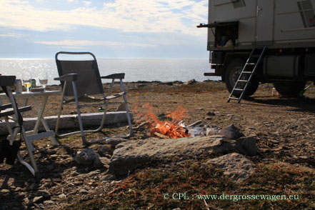 Wir fahren noch ein Stück weiter, um morgen keine zu lange Anfahrt zum Gros Morne Nationalpark zu haben, denn wir wollen früh zu einer Wanderung starten. An einem Platz mit schöner Aussicht oberhalb der Küste bleiben wir. Es ist ziemlich windstill, auch nicht ganz so kalt - endlich mal wieder Gelegenheit für ein Lagerfeuer.