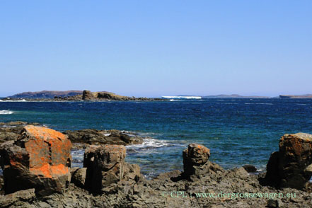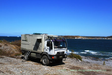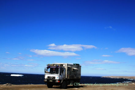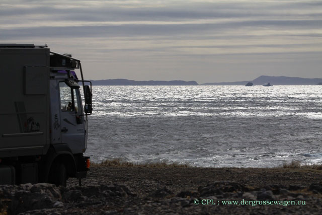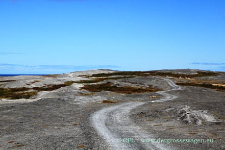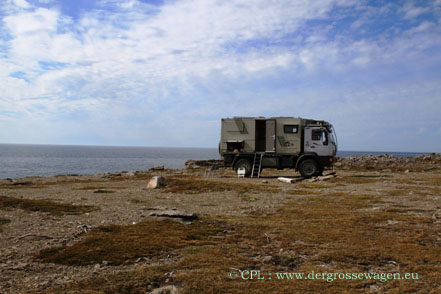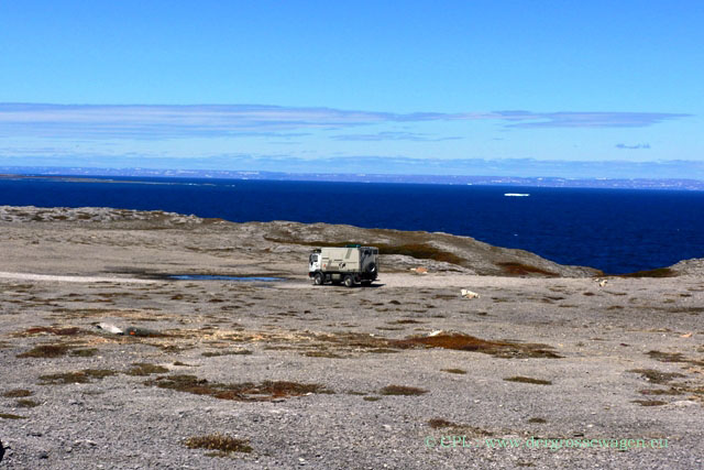 Auch Cape Onion lohnt den Abstecher; an der Küste Eisberge, Wale sehen wir allerdings keine. Dafür ist es nach Auskunft der Einheimischen noch ein wenig zu früh, man rechne aber jeden Tag mit dem Eintreffen der Meeresgiganten. Auf dem Rückweg ein weiterer Abstecher - das Burnt Cape Provincial Ecological Reserve liegt sowieso nahezu an der Strecke. Über eine Piste fahren wir hinauf in das Schutzgebiet, in dem seltene Pflanzen zu finden sein sollen. Blühende Pflanzen sind derzeit nur wenige zu sehen, auch dafür ist es hier wohl noch etwas früh. Übernachten ist im Gebiet nicht erlaubt, aber außerhalb finden wir einen guten Platz für die Nacht.