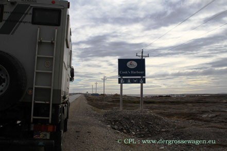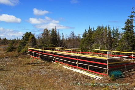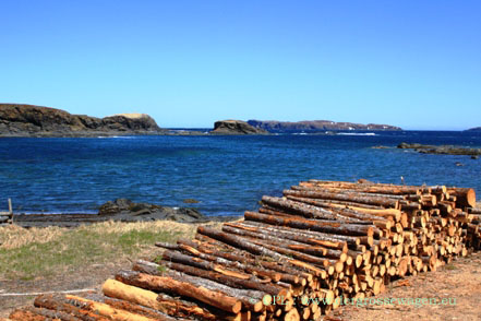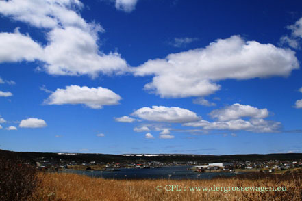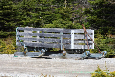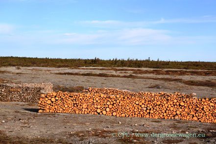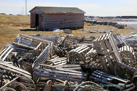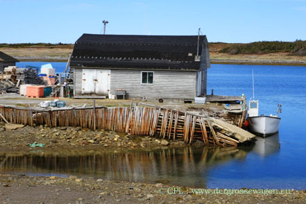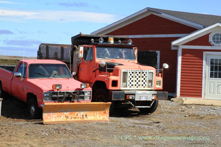 Der Wetterbericht hat recht behalten, die angekündigte Besserung tritt tatsächlich ein. Es ist zwar nach wie vor kühl, aber es regnet nicht, die Sonne lässt sich blicken, fotogene Wolken - was will man mehr. Bis zur Pistolet Bay waren wir ja gekommen, nun schauen wir uns die nördlichen Zipfel an. Über Cook's Harbour fahren wir hinaus zum Cape Norman. Unterwegs sehen wir am Straßenrand, teilweise weitab von jeder Siedlung, immer wieder kleine "Gärten", die von den Einheimischen nach dem Straßenbau angelegt worden sind und nun zum Gemüseanbau genutzt werden. Außerdem liegt überall Unmengen an Holz herum, Vorbereitung auf den langen Winter. Die großen Schlitten, mit denen es im Winter zu den entfernt liegenden Häusern transportiert wird, stehen betriebsbereit direkt daneben.