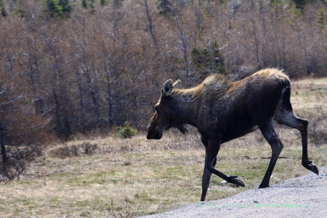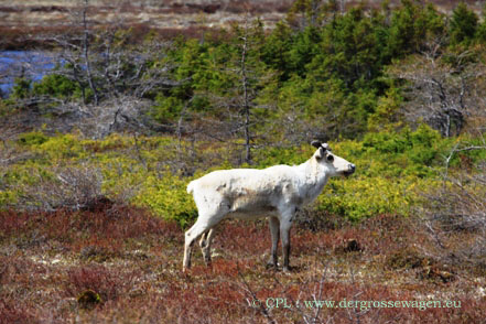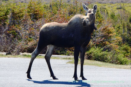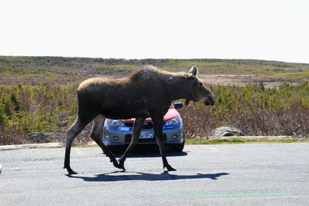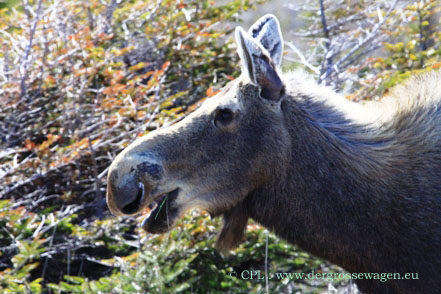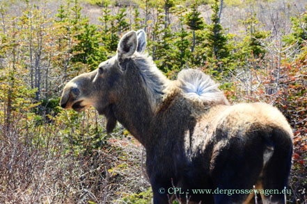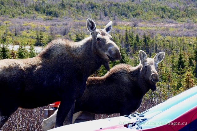 Das "Living Museum", das nicht weit entfernt liegt, schauen wir uns nicht an. Dafür haben wir aber an der Küste Gelegenheit, größere Eisberge zu sichten. Auf dem Parkplatz der Anlage haben wir dann auch noch Gelegenheit, eine Elchkuh mit ihrem Jungen ausführlich zu beobachten.