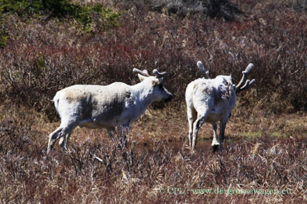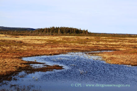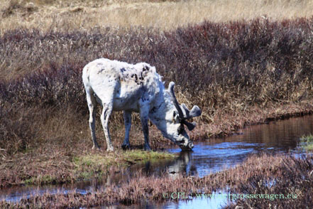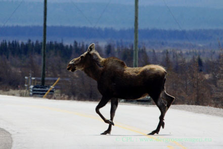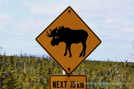 Im Bereich ausgedehnter Sumpfebenen immer wieder Hinweisschilder auf Elche. Und in der Tat sehen wir entlang der Strecke, die wir mehrfach befahren, unglaublich viele Elche und vereinzelt auch Karibous.