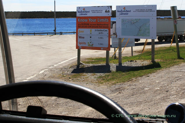 An der Fährstation St. Barbe, wo die Labrador-Fähren ankommen und ablegen, wundern wir uns ein wenig über die Hinweistafeln Alkohol betreffend. Es wird doch gar keine Grenze überschritten. Aber in Neufundland und Labrador will man halt anscheinend noch etwas strikter sein als sonst in Canada. Erstaunlicherweise gibt es aber trotzdem selbst in kleineren Ortschaften einen Liquor Express, wo zu teuren Preisen Hochprozentiges verkauft wird.
