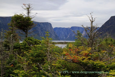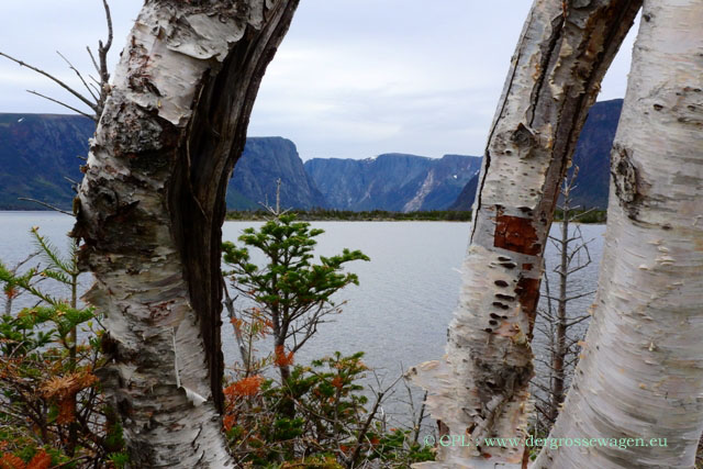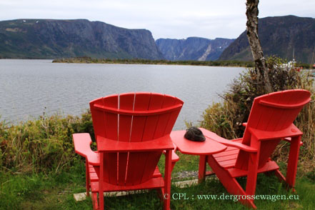 Die Sicht wird ein klein wenig besser, und so wandern wir im Gros Morne National Park zum Western Brook Pond. Der Western Brook Pond ist ein ehemaliger Fjord, der aber heute vom Meer abgetrennt ist. Das Wasser hat Trinkwasserqualität, er zählt zu den saubersten Seen der Welt. Unterwegs viele blühende Pflanzen. Und - rote Stühle! Für eine Bootstour, die am Endpunkt der Wanderung startet, ist uns einerseits das Wetter nicht gut genug, andererseits ist Sonntag. Da wird es sicherlich voll werden. Und so ist es denn auch, auf dem Rückweg kommen uns ganze Scharen entgegen, die zur Bootsanlegestelle unterwegs sind, um das in der Vorsaison nur einmal täglich fahrende Boot zu nehmen.
