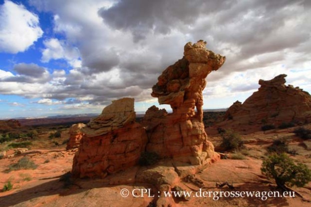 Als dann noch eine extrem steile, noch tiefsandigere und enge Abfahrt kommt, fahren wir nicht weiter. Es ist zweifelhaft, dass wir diese Strecke auf dem Rückweg (und wir müssen hier zurück, da wir nach Coyote Buttes South wollen, die andere, wahrscheinlich leichtere Route kommt deshalb nicht in Frage!) schaffen. So stellen wir das Fahrzeug ab und wandern das letzte Stück zu White Pocket querfeldein. Leider ist der Tag schon weit fortgeschritten, so dass wir für dieses wunderschöne Gebiet nicht die Menge an Zeit zur Verfügung haben, die wünschenswert wäre. Deshalb können wir nicht in alle Bereiche vordringen. Aber auch so ist es schon sehr eindrucksvoll.