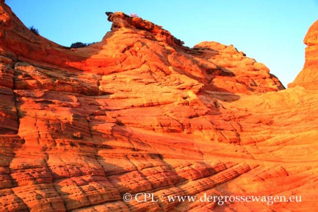 Als dann noch eine extrem steile, noch tiefsandigere und enge Abfahrt kommt, fahren wir nicht weiter. Es ist zweifelhaft, dass wir diese Strecke auf dem Rückweg (und wir müssen hier zurück, da wir nach Coyote Buttes South wollen, die andere, wahrscheinlich leichtere Route kommt deshalb nicht in Frage!) schaffen. So stellen wir das Fahrzeug ab und wandern das letzte Stück zu White Pocket querfeldein. Leider ist der Tag schon weit fortgeschritten, so dass wir für dieses wunderschöne Gebiet nicht die Menge an Zeit zur Verfügung haben, die wünschenswert wäre. Deshalb können wir nicht in alle Bereiche vordringen. Aber auch so ist es schon sehr eindrucksvoll.
