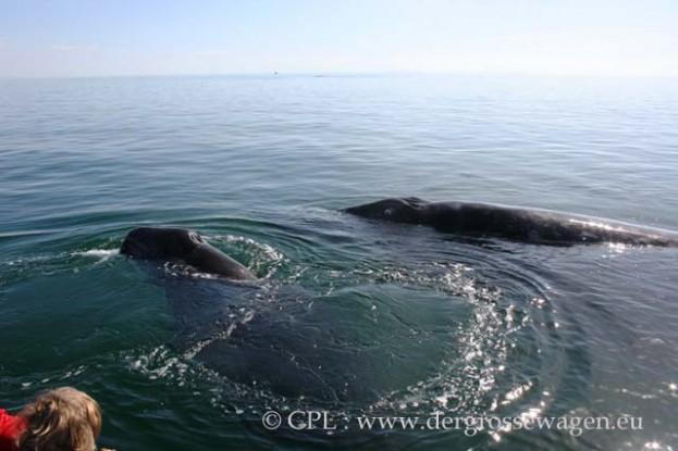 Der nächste Morgen ist mal wieder einer ohne Wind! Also um 8 Uhr zum Ticket Office. Wir zahlen 45 Dollar je Person, müssen etwas warten, bis noch weitere Personen dazukommen. Belegt mit 6 Erwachsenen und 1 Kind geht es dann im Panga-Boot los. Es ist unvorstellbar, überall um uns herum Wale, man weiß gar nicht, wo man zuerst hinschauen soll. Sie kommen teilweise ganz nah ans Boot heran - man hört sie atmen, schnauben, ausblasen. Ein einmaliges Erlebnis!