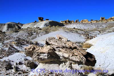 Zur selben Wilderness, aber noch deutlich weniger besucht, zählt auch das De-Na-Zin-Gebiet. Hier gilt allerdings für die Zufahrt wieder, dass diese bei Nässe nicht zu fahren ist. Im De-Na-Zin-Gebiet beeindrucken uns vor allem die Unmengen an versteinertem Holz, teilweise Stämme enormer Größe.
