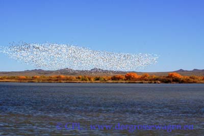Unser Ziel ist das Bosque del Apache National Wildlife Refuge, wo wir auch bei unserer letzten Reise schon zweimal waren (Bericht 1 und Bericht 2). Diesmal sieht es hier ganz anders aus. Es ist viel trockener, und der Baumbestand zeigt sich in einer herrlichen Herbstfärbung. Zwar sind noch nicht so viele Zugvögel wie bei unserem ersten Besuch im Februar 2010 da, aber etliche tausend Schneegänse und Kraniche sind bereits eingetroffen.