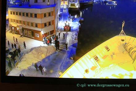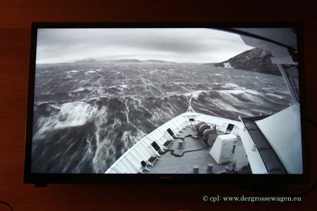 Zumindest hat unsere Kabine freien Blick nach außen, liegt wie gewünscht auf der Hafenseite, also Backbord. Wenn beide Betten betriebsbereit sind, ist es zwar etwas eng, aber wir klappen sie tagsüber einfach weg, können dann das Sofa besser nutzen und haben Bewegungsraum. Auf dem Fernsehschirm können wir die Route des Schiffes auf einer Karte verfolgen; eine Bugkamera liefert auf Wunsch Live-Aufnahmen.