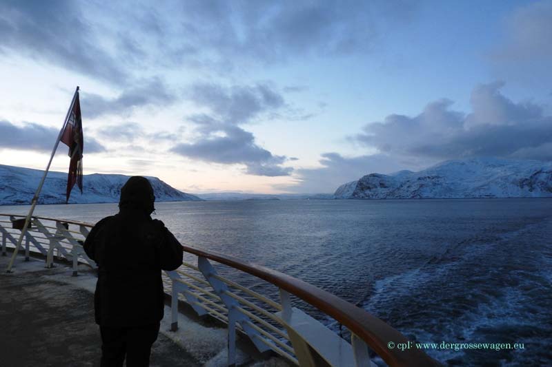 Unsere Hoffnung auf Nordlicht wird aber erst einmal enttäuscht. In Mehamn schneit es heftig, die Außendecks sind gesperrt. Aber bei dem Schneetreiben würde man eh nichts sehen. Später bessert sich die Lage, die Wolken verschwinden. In der Nacht ist das erste, allerdings nur sehr schwache Nordlicht zu sehen. Und natürlich ist es quasi unmöglich, auf dem bedingt durch den immer noch starken Wind und Seegang stark schwankenden Schiff eine akzeptable Langzeitbelichtung hinzubekommen.