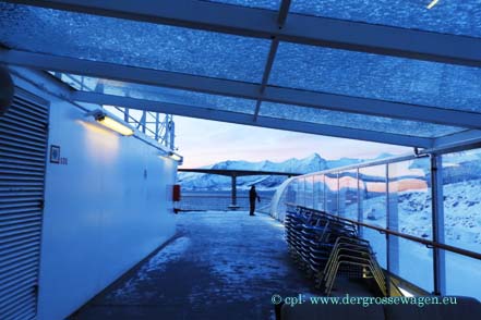 Im Bereich der Lofoten wird die Landschaft dann interessanter, aber es ist dunkel - also keine Fotos! In Svolvaer fällt unser Landgang aufgrund des Regens nur sehr kurz aus. Von der schönen Strecke nach Tromsö sehen wir auch nicht allzu viel. Alles ist wolkenverhangen, 7 Grad plus (!) lassen es nicht schneien, sondern weiter regnen. Der Wind nimmt zu, Aufenthalt an Deck unmöglich. Regen und heftiger Wind lassen uns dann auch auf den Landgang in Tromsö verzichten. Zumindest ist aber das Explorer genannte Panoramadeck ausnahmsweise mal fast leer (die Ausflüge sind natürlich unterwegs), so dass wir dort sitzen können und wenigstens einen guten Blick auf die Stadt haben.