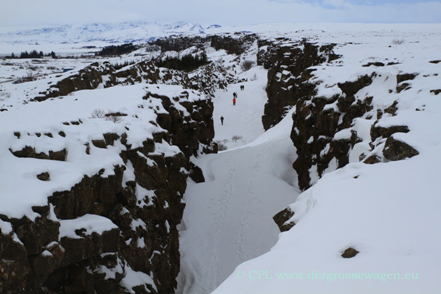 Natürlich fahren wir auch zum Þingvellir-Nationalpark am See Þingvallavatn. Der Ort hat für Isländer eine wichtige Bedeutung, da hier schon im Jahr 930 das erste Alþing, eine parlamentsartige Versammlung einberufen und jährlich abgehalten wurde. Die Almannagjá-Schlucht (Allmännerschlucht) bot dabei ausreichend Platz für alle Teilnehmer. Der in der Schlucht befindliche Wasserfall Öxaráfoss wurde seinerzeit künstlich angelegt, um die Versorgung der Teilnehmer zu sichern. Jetzt im Winter ist er nahezu völlig zugefroren.