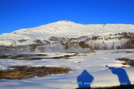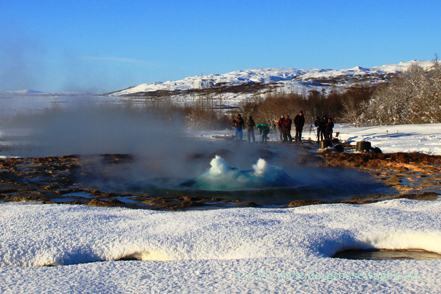 Bei klarem Wetter fallen die Temperaturen wieder, es ist eisig kalt. Zweimal sehen wir nachts Nordlicht, allerdings nur sehr schwaches, das das Fotografieren nicht lohnt. Wir fahren zum Haukadalur. Frühmorgens sind wir noch alleine am Geysir Strokkur, einige Zeit später tauchen dann die ersten Besucher auf.