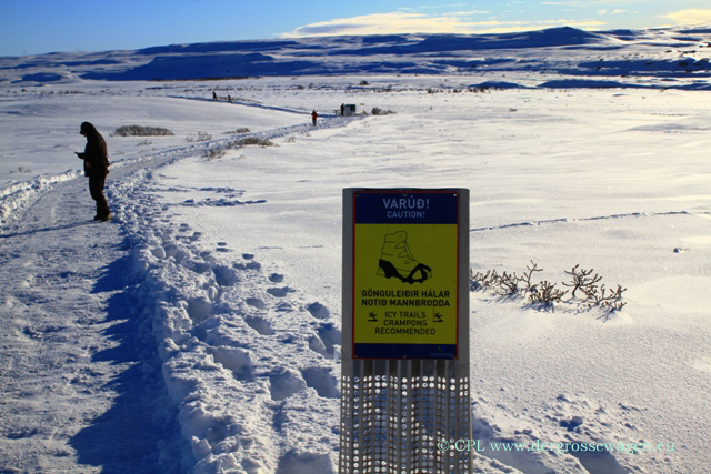 Ein wenig erschrocken sind wir schon angesichts der vielen Touristen, die hier (und im Übrigen im gesamten Golden Circle) unterwegs sind. Von unseren ersten Aufenthalten in den 80er und 90er Jahren kennen wir diesen Bereich noch mit nur relativ wenigen Besuchern. Überall hat es geheißen, im Moment seien angesichts der Corona-Krise so wenig Touristen wie sonst nie auf der Insel unterwegs. Wie muss es dann erst in "normalen" Zeiten hier aussehen!?! Gottseidank knubbelt es sich nur an den leicht erreichbaren Stellen in Parkplatznähe so schlimm. Sobald man sich aber auf den vereisten und glatten Wegen ein wenig entfernt, kann man die Schönheit der Landschaft ungestörter genießen.