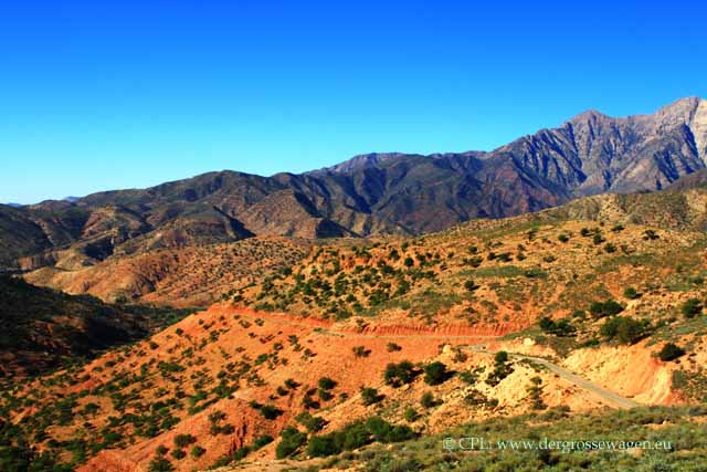 In Nekop biegen wir ab in Richtung Tizi Tazazert im Djebel Sarhro-Gebiet. Welche Überraschung! Eigentlich erwarten wir eine Piste, stattdessen gibt es zunächst eine neue asphaltierte Straße, die uns langsam hinauf in die Bergwelt mit schönen Formationen führt. Die Straße wird komfortabel weiter ausgebaut.