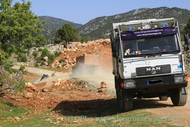 Für die Weiterfahrt nach Beysehir müssen wir eine kleine Straße am Beysehir-See entlang nehmen. Zunächst ist das auch kein Problem. Aber dann plötzlich ein Gesperrt-Schild: Bauarbeiten. Eine Umleitung gibt es nicht; wir können doch nicht die ganze Strecke zurückfahren, so schön sie auch war. Also beschließen wir weiterzufahren, noch bemerken wir auch nichts von irgendwelchen Bau-Aktivitäten. Aber dann plötzlich doch. Die Arbeiter schauen verdutzt auf, wenn wir vorbeikommen, aber viele winken sogar freundlich. Egal, wir erreichen die Verbindung nach Beysehir.