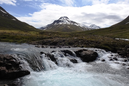 Für die letzten Tage haben wir uns eine Strecke nicht allzu weit entfernt von Egilsstađir ausgesucht, die 953 hinaus zum Mjóifjörđur und zu den Leuchttürmen von Dalatangi. Die Schotterstraße führt zunächst durch das Tal der Eyvindará. Später geht es dann sehr steil hinauf in eine großartige mit Schnee bedeckte Berglandschaft, auf der ebenso steilen Abfahrt dann vorbei am sehenswerten Wasserfall Klifbrekkufossar hinunter zum Fjord.