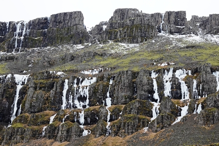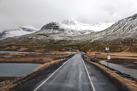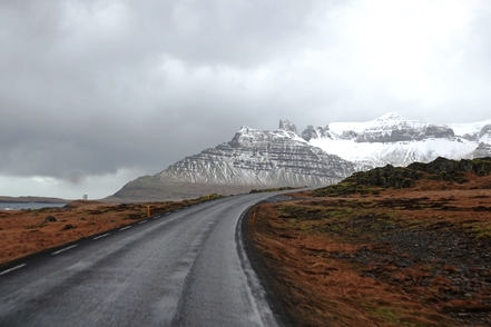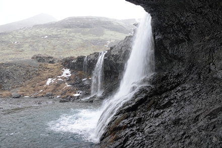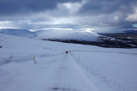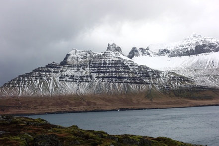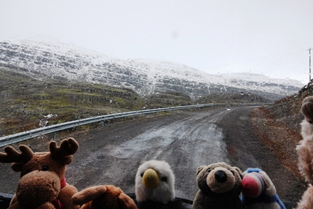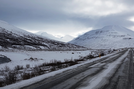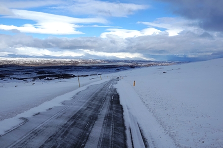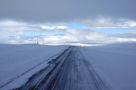 Die Wartezeit an Bord der Norröna im Hafen von Seyðisfjörður haben wir dazu genutzt, die Wetterprognosen für die nächste Zeit genau zu studieren. Nach Stand der Dinge erscheint es uns sinnvoller, im Uhrzeigersinn zu fahren, also zunächst auf der Ostseite der Insel gen Süden. Davor heißt es aber erst einmal, die Steigungspassage über die Fjarðarheiði zu schaffen. Konnten wir vor Abreise mehrfach beobachten, dass diese Strecke geschlossen (weil unpassierbar) war, ist sie heute offen, allerdings als schwierig gekennzeichnet. Und so ist es auch, wir sind froh über unsere Spikes, ist es doch teilweise recht rutschig. Das Wetter bessert sich zusehends.