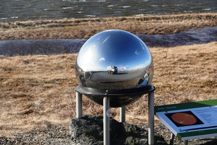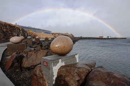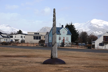 Das Kunstwerk Eggin i Gleðivik in Djupivogur besteht aus 34 großen Eiern, die jeweils für einen lokalen Vogel stehen. Schnell noch ein Blick auf den Ort, zum Herumlaufen ist es viel zu stürmisch, also geht es weiter. Allerdings nicht sehr weit, denn die 1 ist wegen des Sturms für die Weiterfahrt gesperrt. Was tun? Wir warten erst einmal ab, irgendwann sehen wir wieder Autos fahren. Schnell die Straßenbedingungen gecheckt – richtig, die 1 ist wieder für den Verkehr freigegeben. Also fahren wir weiter. Die Böen sind teilweise extrem, irgendwann macht das Weiterfahren keinen Sinn mehr. Wir werden diesen Sturm erst einmal aussitzen.