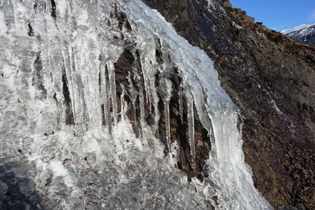 Später fängt es dann zunächst an zu schneien, fahren können wir nicht, da Teile der Ringstraße wieder gesperrt sind. In der Nacht nimmt der Wind erneut so stark zu, dass an Schlaf nicht zu denken ist. Mehrmals stellen wir den MAN um, drehen ihn in den Wind, der leider des öfteren die Richtung wechselt. Das nervt ganz gewaltig. Morgens fahren wir im Sturm ein Stück weiter bis zu einer Stelle, wo der Wind etwas weniger tobt. Hier warten wir einige Stunden ab, zumal auch die Straßenverhältnisse sehr schlecht sein sollen.