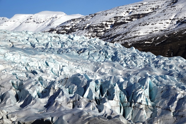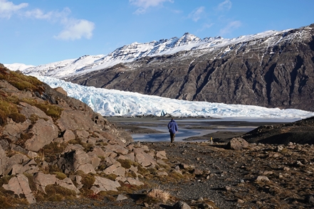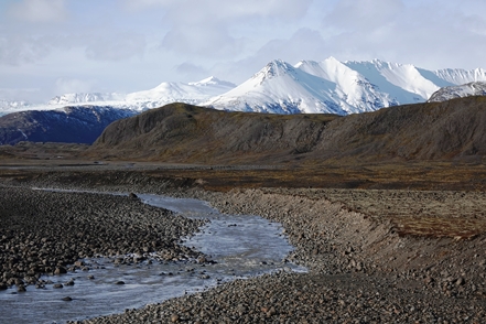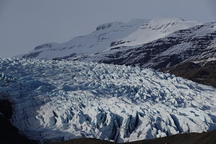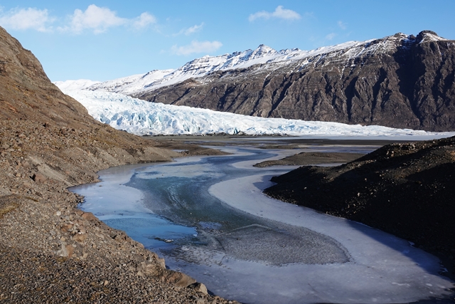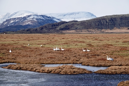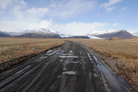 Schnee liegt nur noch auf den Bergen, die Singschwäne sind dabei, ihre Reviere zu besetzen. Wir biegen ab auf eine Schlagloch- und Wellblechpiste, die zwar etwas weich, aber gut machbar ist, um zum Flaajökull-Gletscher zu gelangen. Das Wetter ist eigentlich fantastisch, wenn denn nur der Wind nicht wäre. Dieser nimmt immer weiter zu, für unsere Wanderung müssen wir wohl auf morgen warten.