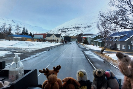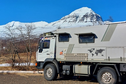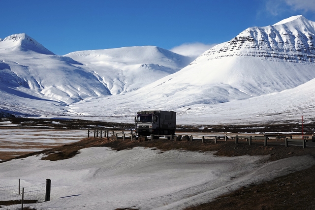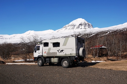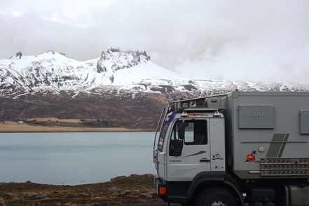 Der Schnee in tieferen Lagen wird weniger. Sehr weit fahren wir heute nicht mehr. In Faskruðsfjörður bleiben wir auf dem kleinen Campingplatz. Dieser ist zwar noch geschlossen, aber das Gelände ist zugänglich. So verbringen wir die erste Nacht auf Island in schöner Umgebung. Die Befestigung des Auspuffs wird kontrolliert und erneut in Ordnung gebracht. Wir können uns nur schwer erklären, wieso das Endrohr immer wieder aus dem Topf rutscht, obwohl die Schelle fest angezogen ist.