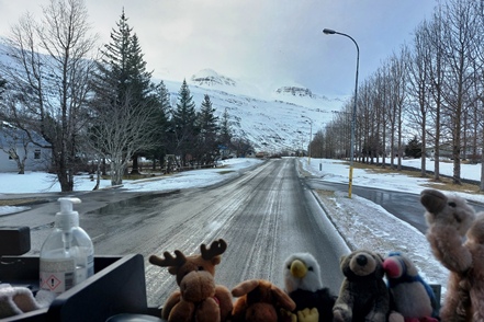 In Egilsstaðir geht es dann erst einmal zu den beiden Supermärkten. Hier sind wir erschrocken. Island war immer schon ein teures Reiseland, das wissen wir aus unseren früheren Reisen natürlich. Aber gegenüber unserem letzten Besuch 2022 scheinen uns die Preise regelrecht „explodiert“ zu sein. Hier nur einige wenige Beispiele: ein Brot liegt bei 7 Euro, ein Muffin oder Croissant bei 2,50 Euro, 2 Stückchen Fisch bei 20 Euro und so weiter und so fort. So fällt der Einkauf frischer Lebensmittel erst einmal etwas geringer aus, zumal das Angebot auch nicht überzeugend ist. Zumindest hier erhoffen wir uns mehr Auswahl anderswo. Dafür tanken wir aber zu recht guten €1,719/l. Leider ist das Endrohr des Auspuffs wieder einmal lose, diesmal im Gegensatz zu den letzten Malen in Skandinavien sogar runter gefallen und muss im Schneematsch neu befestigt werden.
